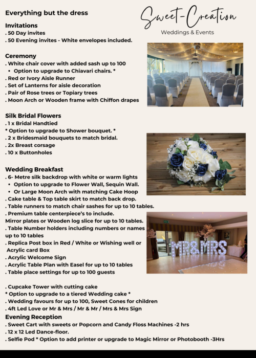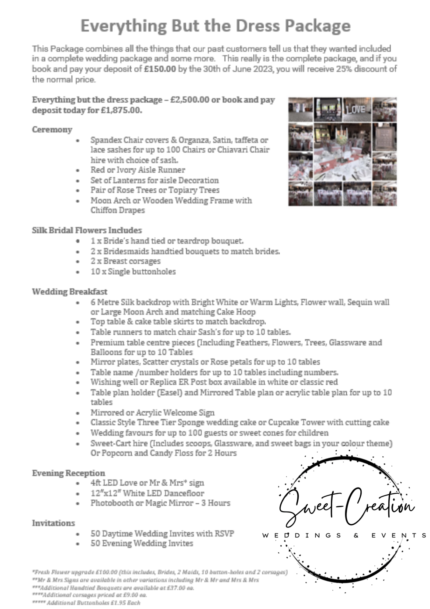 Everything but the dress package – £2,500.00 35% Discount if booked via the website.