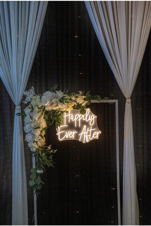 Our ‘Happily Ever After’ neon sign is available in a warm white light attached to a white freestanding frame which a simple flower arrangement of roses and foliage.