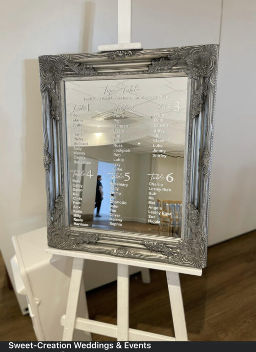A table plan of upto 9 tables plus to table on a large ornate mirror, comes supplied with White Easel.