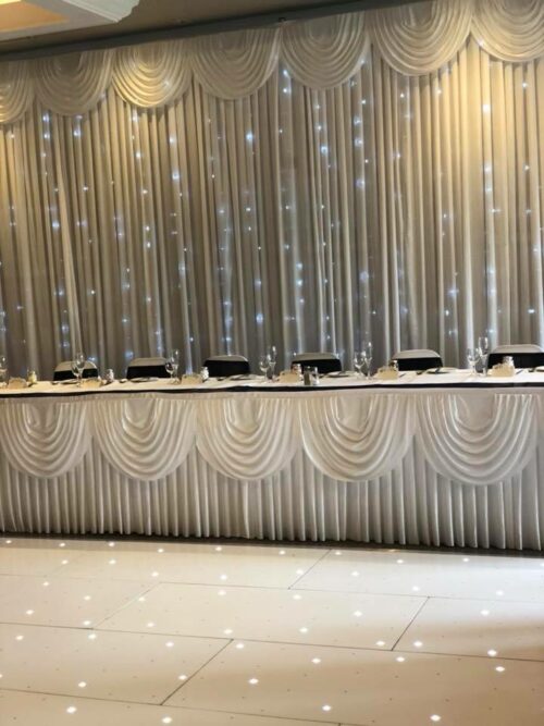 Large Silk 6metre Backdrop curtain for hire with warm or bright white led light curtain.